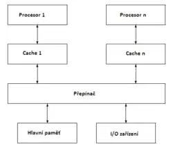 Každý procesor je propojen s vlastní vyrovnávací pamětí (která může být rozdělena na vyrovnávací paměť určenou pro data a vyrovnávací paměť pro instrukce). Tato vyrovnávací paměť je napojena na interní sběrnici popř. přepínací síť zajišťující řízení přenosu dat mezi těmito paměťmi a pamětí operační. Na přepínací síť bývají taktéž zapojeny některá rychlá I/O zařízení (například grafický akcelerátor) či řadiče sběrnic (PCI). Blokové schéma architektury SMP je naznačeno na prvním obrázku vpravo.