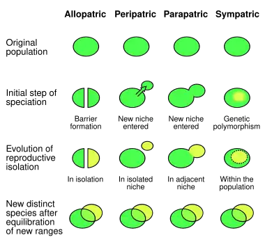 Sympatrická speciace je jednou ze čtyř tradičních geografických kategorií fenoménu speciace.[3][4] Nejblíže k ní má speciace parapatrická, při níž dochází k vývoji nových druhů na vzájemně čátečně překrytých územích, dále speciace peripatrická, k níž dochází u sousedních, ale nepřekrývajících se populací, a nakonec speciace alopatrická, u níž jsou populace geograficky zcela odděleny. Tyto kategorie vytváří škálu od nulové (sympatrie) až po úplnou (alopatrie) geografickou segregaci oddělujících se skupin, přičemž v prvním případě neexistuje geografická překážka genetickému křížení skupin, zatímco v posledním případě ke křížení mezi jedinci z obou populací vůbec nedochází.[4]