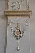 Hlavní sál má barokní klenbu s bohatou štukovou výzdobou z doby kolem roku 1700. Obsahuje reliéfní vyobrazení ovocných květů a vinné révy s hrozny, které v židovské symbolice představují synonymum moudrosti. Samotná vinná réva pak symbolizuje dvanáct izraelských kmenů. Nad jižní galerií jsou nápisy „Samt“, „Matan“, „Damast“ a „Atlas“ - zkratky pro jednotlivé žalmy, které Židé počítají mezi tzv. Ktuvim, tedy spisy, součást Tanachu.[5]