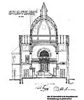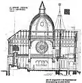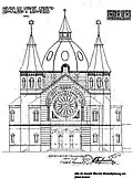 Jednalo se o samostatně stojící čtvercovou sakrální stavbu bazilikálního typu, s jedním centrálním dómem a dvěma postranními věžemi. Nad portálem bylo velké rozetové okno s motivem Davidovy hvězdy, v půlobloukou nad ním hebrejský žalm כי ביתי בית תפילה יקרא לכל העמים - "Můj dům se bude nazývat domem modlitby pro všechny národy" (Izajáš 56:7).[5]