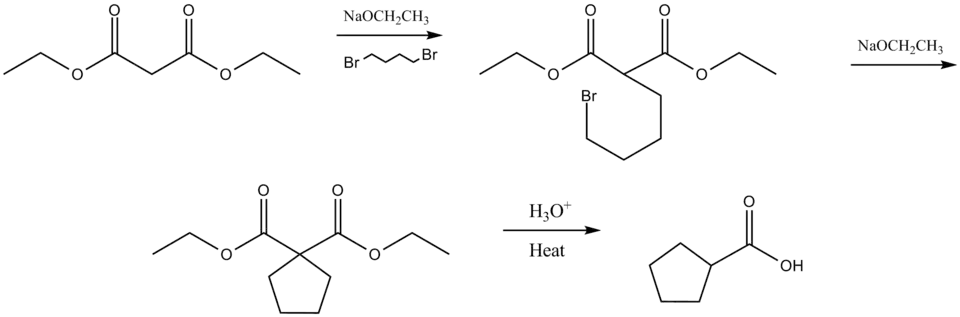 Při použití dihalogenidů může syntéza malonátových esterů probíhat vnitromolekulárně;[4] tato varianta bývá označována jako Perkinova alicyklická syntéza.[5]