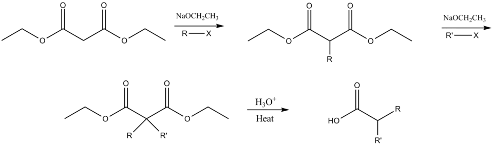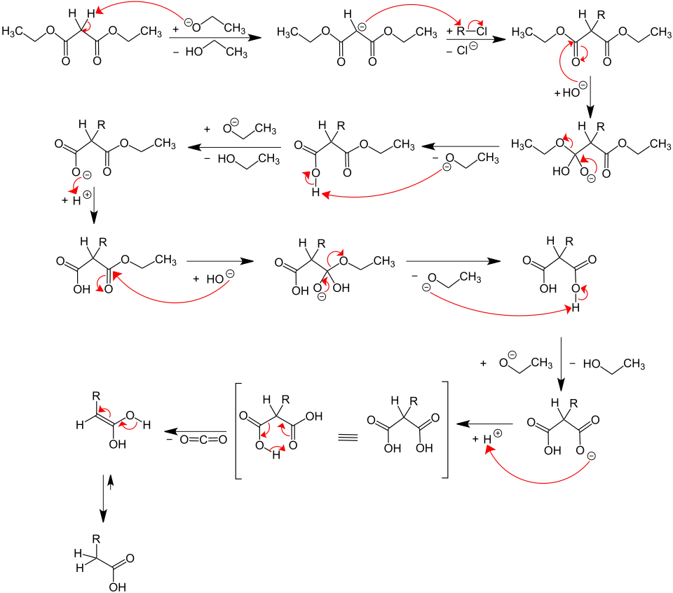 Reakce začíná deprotonací uhlíku v poloze alfa vůči karbonylové skupině silnou zásadou. Vzniklý karboanion může vstoupit do nukleofilní substituční reakce s alkylhalogenidem za vzniku alkylované sloučeniny. Zahříváním se diester dekarboxyluje na kyselinu octovou s navázanou skupinou R;[3] malonátový ester tak lze považovat za ekvivalent syntonu −CH2COOH.