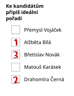 Na hlasovacích lístcích jsou seřazena jména všech kandidátů, kteří kandidují v daném volebním obvodě. Volič ke každému jménu přiřadí číslo podle míry své preference kandidátů. Kandidáta, kterého si nejvíce přeje zvolit, označí číslem jedna, kandidáta, který je pro něj druhý nejpřijatelnější, označí číslem dvě a tak dále. První preferenční hlas volič udělit musí, udělení nižších preferenčních hlasů může být povinné nebo zůstává na jeho uvážení. Volič, který vyplnil hlasovací lístek na obrázku, vyjádřil přání volit kandidáty v tomto pořadí: