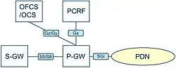 - Gx: toto rozhraní používá P-GW ke komunikaci s Policy and Charging Rules Function (PCRF), aby zpracovávat Strategie a Zpoplatnění Pravidla (PCC) pravidla. Tato pravidla obsahují účtovací informace a parametry Quality of Service (QoS), které se použijí při aktivaci přenosu. Na rozhraní Gx se používá protokol Diameter.