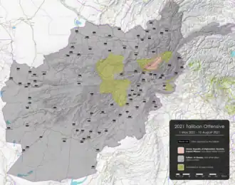 Během stahování amerických jednotek ze země v létě roku 2021 zahájil Tálibán velkou ofenzívu v Afghánistánu. K 23. červenci 2021 Tálibán ovládal více než polovinu z 421 afghánských okresů.[24][25]