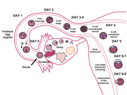 V tomto čase existuje jediná totipotentní (schopna dělením produkovat každý buněčný typ v organismu) buňka – zygota – geneticky jedinečný nový organismus. Mitotické buněčné dělení je následující proces, při kterém se každá buňka rozdělí na další diploidní buňky. Zygota se dělí, produkujíc 2 menší buňky zvané blastomery, které se následně taktéž dělí každých 20 hodin. Tyto buňky se postupně zmenšují, až po asi 4 děleních vznikne 16 individuálních buněk. Tato skupina 16 buněk se nazývá morula a obvykle opouští vejcovod a postupuje do dělohy. Nedostane-li se do dělohy, vzniká ektopické těhotenství (mimoděložní).