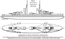 Do stavby dreadnoughtů, nové kategorie bitevních lodí, vzniklé nedlouho před první světovou válkou, se zapojila rovněž Itálie. Prvním plavidlem nové kategorie se stala bitevní loď Dante Alighieri, na kterou navázala stavba tří vylepšených jednotek třídy Conte di Cavour. Vrcholem stavby italských předválečných dreadnoughtů se staly dvě jednotky třídy Andrea Doria.[1] Konstrukce vycházela z předchozí třídy Conte di Cavour, od které se odlišovaly umístěním předních a zadních dělových věží blíže k sobě (A, B a X, Y) a prostřední dělová věž (Q) byla o úroveň níž na hlavní palubě.