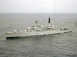 Hlavňovou výzbroj po tvořil jeden 114mm kanón Mk.8 v dělové věži na přídi, později doplněný o dva 20mm kanóny. Protiletadlovou výzbroj představovalo dvojité vypouštěcí zařízení protiletadlových řízených střel středního dosahu Sea Dart s dosahem okolo 60 km. Zásoba střel činila 40 kusů. Protiponorkovou výzbroj tvořil jeden raketový systém Ikara se zásobou 32 raket a jeden salvový vrhač hlubinným pum Mk 10 Limbo. Na zádi se nachází přistávací plocha pro vrtulník. Postrádal však hangár, neboť měl operovat společně s letadlovými loďmi, takže se jevil zbytečným. Pohonný systém je koncepce COSAG. Kombinuje dva kotle Babcock & Wilcox se dvěma soustavami parních turbín o výkonu 30 000 hp a dvě plynové turbíny Rolls-Royce Olympus TM1A o výkonu 44 000 hp. Lodní šrouby byly dva. Nejvyšší rychlost dosahovala 30 uzlů. Dosah byl 5000 námořních mil při rychlosti 18 uzlů.[1]