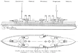 | Výzbroj | 4× 305mm kanón (2×2) 12× 240mm kanón (6×2) 16× 75mm kanón (16×1) 8× 47mm kanón 2× 457mm torpédomet |