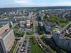 Ulici obklopují panelové domy, podél kterých vedou nadzemní zastřešené chodníky. Třída byla projektována jako hlavní dopravní komunikace a předpokládala se vysoká míra dopravy. Proto byly obytné bloky umístěny dále od vozovky tak, aby byly splněny tehdy platné hlukové limity.