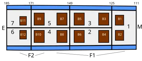 111…185 – vodotěsné přepážky na úrovni žeber č. 111 až 185