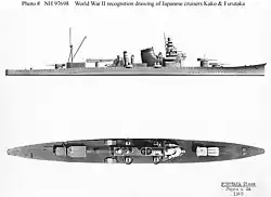 | Výtlak | Projektovaný: (7100 T standardní) 7500 T normální 8568 t 2/3 při zkouškách Kako 18. července 1926: 7601 t lehký 7950 T standardní 8530 T normální[1] 9502,1 t 2/3 při zkouškách[2] 10 252 t plný[1] Po rekonstrukci:[p 1] Kako: 8626 t lehký Furutaka: 8561 t lehký Kako: 10 535 t 2/3 při zkouškách Furutaka: 10 507 t 2/3 při zkouškách Kako: 11 295 t plný Furutaka: 11 273 t plný[1] |