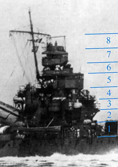- Střední paluba (中部甲板 čúbu kanpan nebo jen 中甲板 čú kanpan) probíhala po celé délce trupu bez přerušení. Na přídi se nacházel skladovací prostor, za kterým následovaly kajuty důstojníků, muniční manipulační komory pod lafetacemi č. 1 a 3 hlavní baterie a přední torpédovna. Střední částí procházely kouřovody komínů a větrání kotelen a strojoven. Nad strojovnami se nacházely zbývající dvě torpédovny a manipulační komora pod lafetací č. 4. Kromě manipulační komory pod lafetací č. 6 se na zbytku zádě nacházely převážně kajuty mužstva.[27]