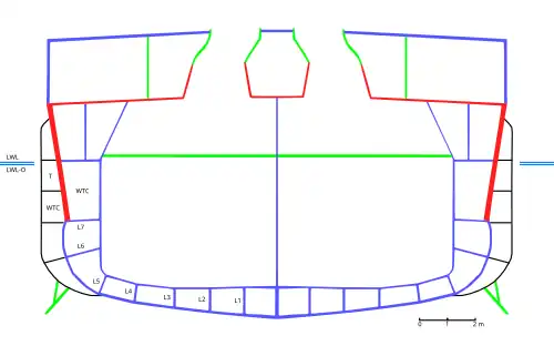 - modrá - pláty z vysokotažné ocele tvořící kýl, podélná žebra, centrální vodotěsnou přepážku, vnější a vnitřní trup a horní palubu