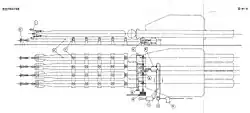 - Skladovací paluba (船艙甲板 sensó kanpan) nad nákladovým prostorem probíhala po celé délce trupu kromě přerušení v prostoru kotelen a strojoven. Na přídi se na ní nacházela skladiště, kajuty mužstva a přední pomocná strojovna. V zadní části se pak nacházela zadní pomocná strojovna, další kajuty mužstva a skladiště. Za žebrem č. 297 (od kterého se skladovací paluba stala nejnižší palubou) se nacházely strojovna kormidla a kormidelna.[27]