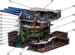 | Pancíř | Hlavní boční pancíř: až 307 mm, odchýlen o 19 stupňů První pancéřová paluba: 38 mm Druhá pancéřová paluba: 121 mm Třetí pancéřová paluba: 16 mm Barbeta: až 439 mm Dělová věž: