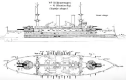 Hlavní výzbroj tvořily čtyři 330mm kanóny umístěné v dvoudělových věžích, na jejichž stropech byly další dvoudělové věže s 203mm kanóny, přičemž obě věže se otáčely společně.[2] Sekundární výzbroj čtrnácti 127mm kanónů byla umístěna v kasematách. Lehkou výzbroj představovalo dvacet 57mm a osm 37mm kanónů.[1] Dále byly neseny čtyři 457mm torpédomety.[3] Pohonný systém tvořilo pět cylindrických kotlů a dva parní stroje s trojnásobnou expanzí o výkonu 10 000 ihp, pohánějící dva lodní šrouby. Nejvyšší rychlost dosahovala 16 uzlů.[1]
