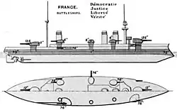 Hlavní výzbroj tvořily čtyři 305mm kanóny umístěné ve dvoudělových věžích na přídi a na zádi. Sekundární výzbroj představovalo deset 194mm kanónů umístěných v šesti jednodělových věžích a v kasematách. Lehkou výzbroj představovalo třináct rychlopalných 65mm (9liberních) kanónů a deset 47mm (3liberních) kanónů. Výzbroj doplňovaly dva 457mm torpédomety. Pohonný systém tvořilo 22 kotlů Belleville (Justice 24 kotlů Niclausse) a tři parní stroje o výkonu 18 500 hp, které poháněly tři lodní šrouby. Nejvyšší rychlost dosahovala 19 uzlů.[1] Dosah byl 8400 námořních mil při 10 uzlech.[2]