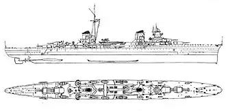 | Výzbroj | 8× 152mm kanón (4×2) 6× 100mm kanón (3×2) 8× 37mm kanón (4×2) 8× 13,2mm kulomet (4×2) 4× 533mm torpédomet (2×2) |