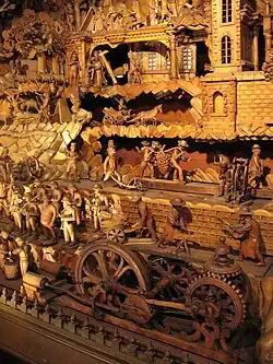 Nejobtížněji realizovatelným pohybem se ukázalo Josefovo kolébání jesliček, údajně jej řešili více než půl roku.[16] Ve scénce u jesliček je vykonáváno přes dvacet synchronizovaných pohybů.[60] Pohyby postaviček se dělí na dva druhy – opakované a opakované se zastavením.[16] Mezi opakující se patří stařena točící kolovrátkem, horníci rubající uhlí, pochodující vojáci či trkající se kozli.[16] Při opakování jiných pohybů nastává krátká přestávka.[16] Například archanděl Gabriel, který zvěstuje Panně Marii Ježíšovo narození se na chvíli pozastaví, než pokračuje ve své pouti; voják probodávající Ježíšův bok nejprve zamíří špičkou kopí než bodne plnou silou; truhlář zpomalí řezání pilkou jakoby narazil na suk; basista táhne smyčcem třikrát, dvakrát a zase třikrát, dvakrát, což pravděpodobně symbolizuje veselou písničku.[16] Poutníci s dary jsou připevněni na soustavě dřevěných řetězů, jež se podobají hnacím řetězům u jízdního kola.[36] Stáří mechanismu omezuje pohyb některých postaviček.[60]