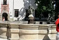 Vnější nádvoří obklopují renesanční hospodářské a správní budovy. Většinu fasád zdobí sgrafita. Na nádvoří stojí kašna z roku 1712, postavená podle návrhu Paollo Ignatia Bayera, s pozoruhodnou plastikou havrana klovajícího Turka. Připomíná vítězství Adolfa Schwarzenberga nad Turky u Raabu. Tento motiv se objevuje také v rodovém erbu Schwarzenbergů.