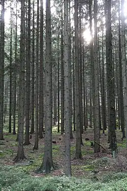 Vzrostlé stromové patro lze rozdělit na stejnověkou smrkovou monokulturu a na listnatý porost, který je až 160 let starý. Listnaté stromy tvoří hlavně javor klen (Acer pseudoplatanus) a buk lesní (Fagus sylvatica). Původně se zde vyskytovala jedle bělokorá (Abies alba), která byla v minulosti zcela vykácena, a tak je v plánu ji znovu vysázet z genetického materiálu z Brd.[7]
