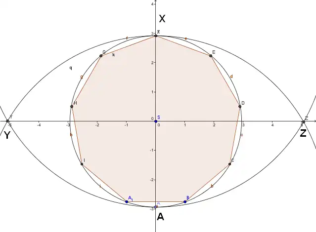 Průměr AX rozdělte na tolik částí, kolik vrcholů má mnohoúhelník mít. Protnutím polokružnice o průměru AX se středem v bodech A a X vzniknou body Y a Z. Spojnice těchto bodů a každého druhého dílčího bodu protnou opsanou kružnici, čímž vzniknou vrcholy požadovaného pravidelného mnohoúhelníku.
