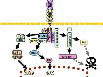 Po navázání TNF ligandu, což je obvykle membránový protein na jiné buňce, dojde k přenosu signálu dovnitř buňky. U tzv. receptorů smrti (např. Fas, TNFR1) dochází přes death doménu k aktivaci kaspáz a tedy k apoptóze. Přenos signálu z ostatních TNF receptorů však řídí proteiny TRAF, kterých je minimálně šest a každá má zřejmě poněkud odlišné účinky na buňku. Tím se také vysvětluje, že TNF receptory mají tak rozmanité funkce. Mnohdy dochází k transdukci přes NF-κB, jindy k aktivaci MAP kináz.[1]