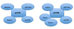 TOR na sebe váže další proteiny v rámci větších komplexů, které se následně označují jako TORC (TOR complex). U savců je označujeme jako mTORC1 a mTORC2. mTORC1 z nich je citlivý na rapamycin a skládá se z proteinů mTOR, raptor a mLST8. Reguluje buněčný růst z časového hlediska (spuštění a ukončení růstu), proteosyntézu, transport živin a autofagii. mTORC2 se skládá z proteinů mTOR, rictor, mSIN1, PRR5 a mLST8 a není citlivý na rapamycin. Podílí se spíše na regulaci prostorového aspektu růstu (např. modulováním aktinového cytoskeletu).[1]