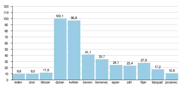 Průměrné měsíční průtoky řeky ve stanici Troshkova v letech 1962 až 1989:[2]