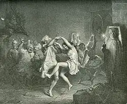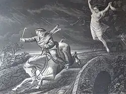 Tam ve své opilosti nikterak nedbal na rej pekelných orgií, který se z kostela, zářícího do noci, ozýval. Naopak kurážně ke kostelu zajel a stal se svědkem půlnočního reje čarodějnic, k němuž jim hrál ďábel na dudy.