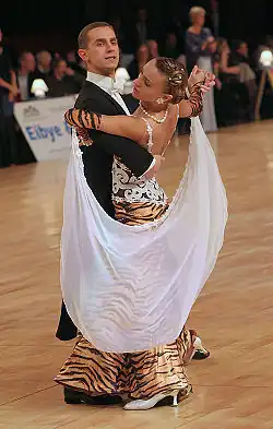 - Otevřená otáčka vlevo, partnerka mimo, otevřené zakončení (Open Reverse Turn, Partner Outside, Open Finish)