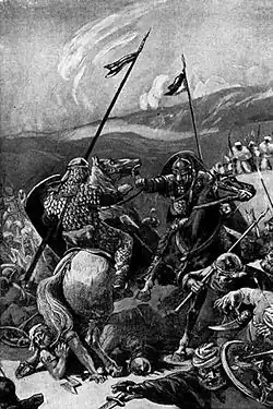 | „ | Hrabě z Normandie spatřil admirálovu standartu ozdobenou zlatým jablkem na hrotu stříbrného kopí, vrhl se divoce na praporečníka a smrtelně jej zranil. Tankred se na své straně vřítil do jejich ležení, a když to ti pohaní viděli, dali se hned na útěk. | “ |