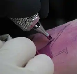 Za pomocí jehly se pod kůži vpichuje barvivo. Tetování se provádí tetovacím strojkem, do kterého se vloží jehla a elektromagnet ji uvnitř strojku rozkmitá (pohyb nahoru a dolů). Při tetování tatér průběžně jehlu namáčí do kalíšku s barvou. Vpichuje se do vrchní vrstvy kůže u některých jedinců i 5 mm hluboko. Profesionálové používají na tetování barviva v souladu s Evropskými normami a s patřičnými atesty, jejichž splnění zajistí minimální riziko alergických reakcí v podobě vypuzení částí barviva z kůže nebo hnisání. Před tetováním tatér místo očistí desinfekcí a nasadí si jednorázové rukavice. Během tetování stírá zbytky barvy, které se nedostaly pod kůži, papírovým ubrouskem. Po dokončení práce se tetování zakryje fólií.