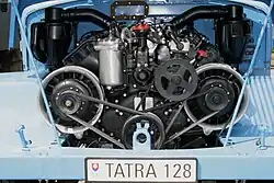 Tatru 128 pohání vidlicový, vzduchem chlazený vznětový osmiválec T 108 s rozvodem OHV a přímým vstřikováním. Motor má zdvihový objem 9883 cm³ (vrtání válců 110 mm, zdvih 130 mm). Dosahuje nejvyšší výkon 96 kW (130 k) při 2000 ot./min. Úhel rozevření řad válců je 75°. Kompresní poměr činí 16,5:1.[2][9]