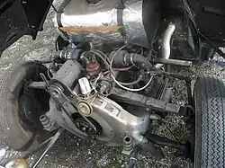 Zážehový čtyřdobý čtyřválec typu boxer, s rozvodem OHV. Kliková skříň je odlita z hliníku, válce jsou z šedé litiny. Chlazení vzduchové s trvalým nuceným prouděním pomocí ventilátoru na klikové hřídeli. Ventilátor je umístěn v uzavřené skříni na předním čele motoru. Z ní proudí vzduch dvěma kanály přes hlavu a horní část oplechovaných válců. Benzínová nádrž na 25 l (T 57) nebo 35 l (ostatní verze) je umístěna v motorovém prostoru na příčné stěně. Palivo je do karburátoru dopravováno samospádem.[9][10]