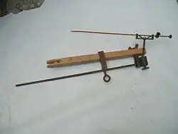 Na kříži je upevněn pomocí svěrky a stavitelného kloubu vlastní tečkovací strojek. Je to směrově nastavitelná objímka s posuvnou jehlou, většinou trojúhelníkového průřezu, která má na sobě zarážku, tak, aby nemohlo dojít k vybrání materiálu až pod povrch.