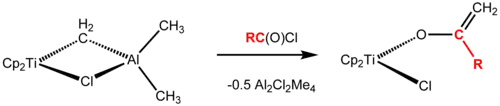 - Cp2Ti(CH3)2 + Al(CH3)2Cl → Cp2TiCH2AlCl(CH3)2 + CH4