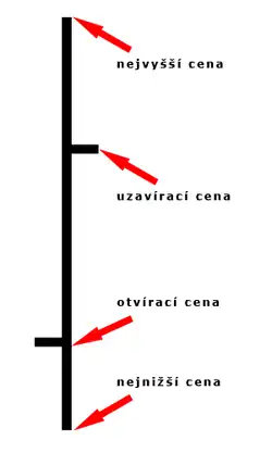 Schodový graf, v angličtině nazývaný „bar chart“, patří mezi tzv. OHLC (open, high, low, close) grafy. Z grafu lze vyčíst nejen cena uzavírací, ale také otevírací, nejnižší a nejvyšší. Průběh ceny je zde detailnější, a proto se lépe zpozorují trendy a cenové formace. Jednotlivý schod (bar), se skládá ze 3 částí. Svislá úsečka nám ukazuje, kde se ceny pohybovaly, tedy vrchol (high) a dno (low). Na tuto úsečku se zleva napojuje kratší, vodorovná část, která značí otevírací cenu. Vpravo od svislé úsečky je stejnou metodou utvořena cena uzavírací. Viz obrázek.