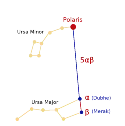 - na severní polokouli podle Polárky (zvaná též Severka, angl. Polaris), která leží téměř přesně nad zeměpisným severním pólem Země, proto se jako jediná hvězda na obloze téměř nepohybuje (resp. pohybuje se, ale to je zanedbatelné, opisuje na obloze jen nepatrnou kružnici). Navíc je velmi jasná. Toto z ní dělá klíčovou hvězdu pro orientaci na severní zemské polokouli. Myšlená kolmice od hvězdy k horizontu (obzoru) ukazuje vždy sever. Pro její nalezení je ideální najít velmi známý asterismus Velký vůz (je součástí souhvězdí Velké medvědice). Dvě zadní hvězdy Velkého vozu (konkrétně Merak a Dubhe) tvoří úsečku, její pětinásobné prodloužení po přímce nad Velký vůz ukáže na Polárku (ta je součástí asterismu Malý vůz, ale ten je hůře viditelný). V podobné vzdálenosti od Polárky, ovšem na opačné straně a mírně odchýlené je souhvězdí Kasiopeja, charakteristické tvarem písmene W. Kasiopeja ani Velký vůz na obloze severní polokoule nikdy nezapadají (s výjimkou rovníkové oblasti).