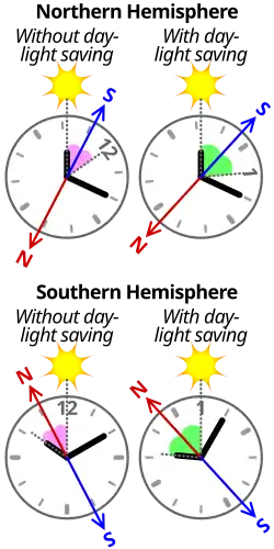 - jižní polokoule – hodinky jsou ve vodorovné poloze, dvanáctka na ciferníku míří na Slunce. Přibližně sever ukazuje pomyslná přímka procházející polovinou úhlu mezi hodinovou ručičkou a dvanáctkou. A opět, pokud zrovna platí letní čas, je třeba půlit úhel mezi hodinovou ručičkou a jedničkou na ciferníku.