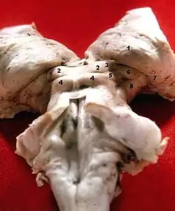 Lidské tectum je redukované do podoby čtverohrbolí: zrakové hrboly jsou pod číslem 2, sluchové hrboly pod číslem 4