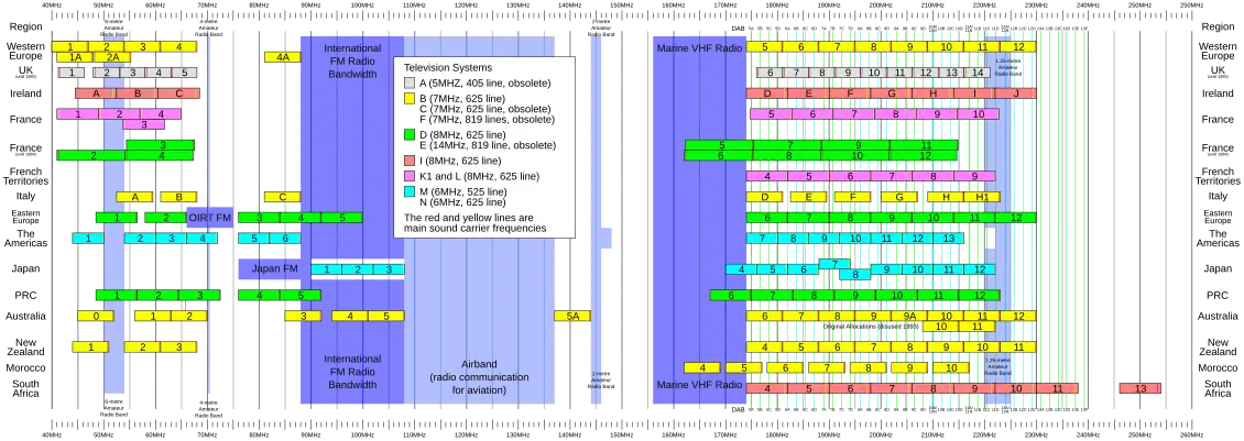 Stálé vysílání televize začínalo ve většině zemí v pásmu VHF na kmitočtech 40 až 230 MHz. Přesné frekvence a šířky kanálů se lišily v různých oblastech světa a někdy i v různých státech, jak to dokumentuje následující obrázek. Kmitočty byly rozděleny na následující pásma:[1]