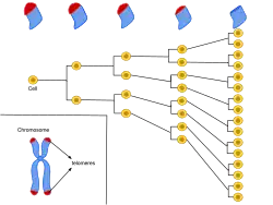 Telomery jsou koncové části chromozomů. Při buněčném dělení se telomery zkracují kvůli neschopnosti enzymu syntetizovat konce lineárních nukleových kyselin. Původní délka se obnovuje obvykle během tvorby pohlavních buněk činností enzymu telomerázy, což je neobvyklá RNA-dependentní DNA polymeráza nesoucí si vlastní molekulu RNA jako templát pro tvorbu DNA. Kromě pohlavních buněk jsou své telomery schopné znovu prodlužovat i kmenové buňky díky přítomnosti vlastní telomerázy. Většina rakovinných buněk také obnovuje své telomery pomocí telomerázy, což umožňuje potlačit růst řady rakovinných buněk blokací telomerázy,[1] část rakovinných buněk ale opravuje své telomery alternativním systémem využívajícím rekombinaci.[2]