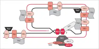 Bílkovinný komplex známý jako shelterin chrání zakončení samotných telomer od rozpoznání za neopravitelné vidlicovité úseky inhibicí homologní rekombinace (HR) a nehomologním spojováním zakončení (NHEJ). Na samém distálním konci telomery se nachází základ 300 bází o jednom vlákně, které formuje T-loop (T-kroužek). Tato smyčka je analogická k uzlu, který stabilizuje telomery, zabraňuje rozpoznání zakončení telomer jako otevřené narušené části pro mechanismus opravy DNA. Když se vyskytne spojování zakončení, které je nehomologní ho typu na koncích telomer, výsledkem nakonec je spojení chromozomální. Smyčka T-loop je dohromady sestavena několika proteiny, zaznamenanými například TRF1, TRF2, POT1, TIN1, a TIN2. Tento soubor je společně označován komplex Shelterin. U lidí je komplex Shelterin složen z 6 bílkovin identifikovaných jako TRF1, TRF2, TIN2, POT1, TPP1, a RAP1.