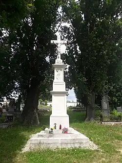 Centrální kříž z lipovského mramoru pochází z roku 1886. Symbolizuje vykoupení a záruku budoucího vzkříšení a na hřbitov jej darovali manželé Franz a Magdaléna Rotterovi. Nejspíš pochází z kamenické dílny rodiny Grögerů z Lipové, konkrétně od kamenosochaře Heinricha Grögera. Ten také v letech 1884 a 1888 vytvořil na náklady obce mramorové náhrobky čestných hrobů manželů Schubertových a Ledelových. Ty se nachází vpravo za centrálním křížem. Pět buků u brány hřbitova a u centrálního kříže zasadil lesní dozorce Johann Haschke.[1]