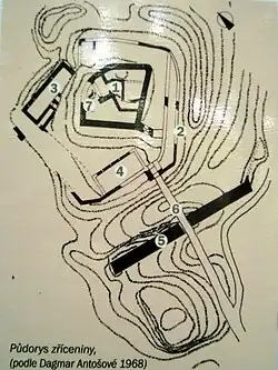 Jsou dochovány zbytky paláce, část plášťového opevnění, brána a studna. Před areálem hradu na kopci je také ruina později založené štítové zdi. Nádvoří jsou pokryta několikametrovou vrstvou sutin. Žádný rozsáhlejší a systematický archeologický průzkum se zde neuskutečnil.[2]