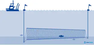- Sítě používané v mělkých vodách, kdy horní část zůstává nad hladinou. Ryby bývají do sítí zahnány hlukem nebo jiným způsobem, až jsou plně obkrouženy tenatovou sítí, do které ryby narážejí a zamotají se do nich.