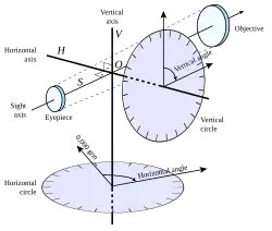 - Z přiloženého obrázku je patrné, že u teodolitu popisujeme tři hlavní přímky, které musí být na sebe kolmé. Osa "V" je svislá (vertikální) točná osa teodolitu, přístroj se kolem této osy otáčí. Osa "Hz" vodorovná (horizontální) točná osa dalekohledu, kolem této osy se otáčí dalekohled ve svislé rovině. Spojením otáčení kolem těchto dvou os dosáhneme možnosti zacílit do všech směrů a přímek, které procházejí průsečíkem těchto dvou os. Osa "Z" je záměrná osa (přímka) dalekohledu (což je spojnice středu nitkového kříže a středu objektivu), zacílením ji ztotožníme s přímkou potřebnou pro měřický výkon. Vzájemná kolmost těchto os je nazývána "osové podmínky teodolitu". Jedná se o tyto podmínky: V je svislá, Hz je kolmá na V a je tedy vodorovná, Z je kolmá na Hz. Případné odchylky od absolutní kolmosti jsou nazývány osovými chybami teodolitu a o odstranění těchto chyb, případně jejich eliminaci měřickým postupem je zpracována rozsáhlá odborná literatura.