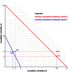 - Země Y je však při výrobě A rychlejší než při výrobě B, a proto, aby vyrobila jeden výrobek A, musí obětovat jen půl výrobku B, zatímco pokud chce vyrobit B, musí obětovat dva výrobky A.